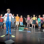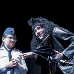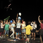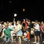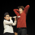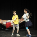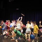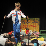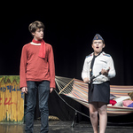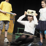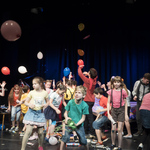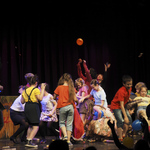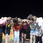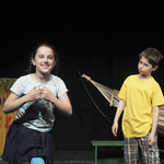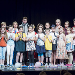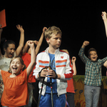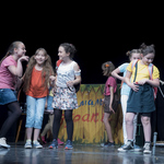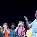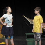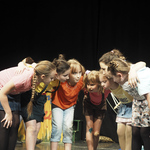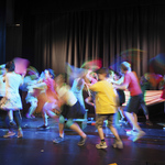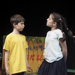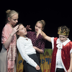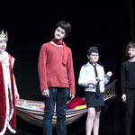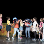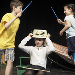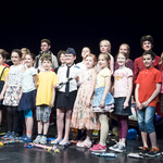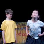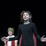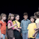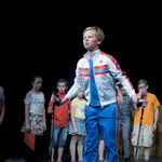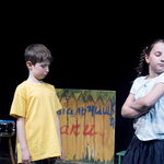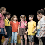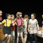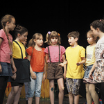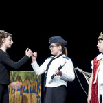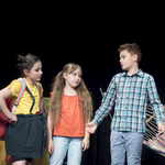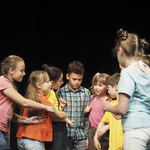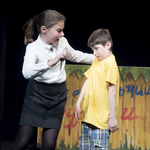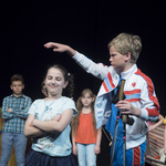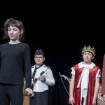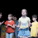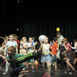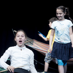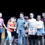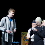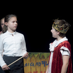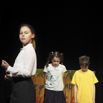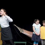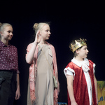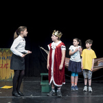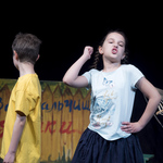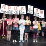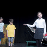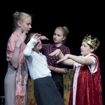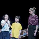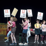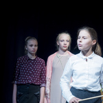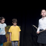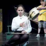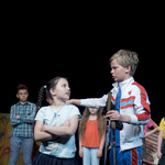 Труднее всего, думается, было ребятам играть в массовых сценах. С одной стороны, ты не один, рядом друзья, помогут, если запнёшься в реплике или пойдешь не в ту сторону, а с другой стороны – ведь очень хочется, чтобы тебя увидели, узнали и запомнили зрители в зале. В спектакле было несколько таких массовых сцен: Красавица (Саша Штейн) с женихами (Филипп Фур, Марк Бауманн, Филипп Шнайдер, Максим Яровой), Великая битва девчонок и мальчишек, Девчонки – Вредины (Лиза Кем, Злата Кушнир, Маша Межирова, Талия Натсикос, Айла Лаура Озджан, Маша Плакхин, Анастасия Хворова, Алексия Юдович) и мальчик Макакий (Филип Фур), а также финальная сцена со всеми героями.